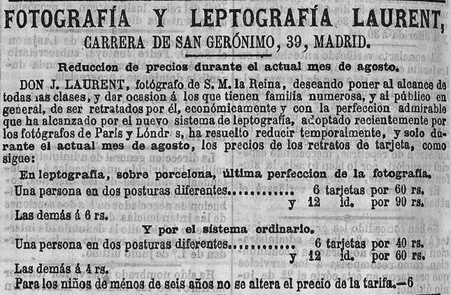En 1.861 ya se anunciaba como “Fotógrafo de S. M. la Reina Isabel II” [11]. El anuncio con este título apareció publicado en "El almanaque político y literario de Iberia" de 1.861.